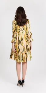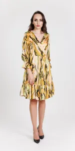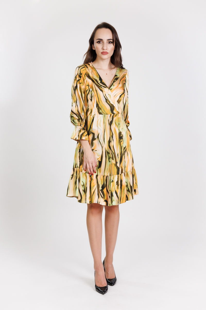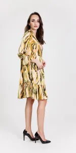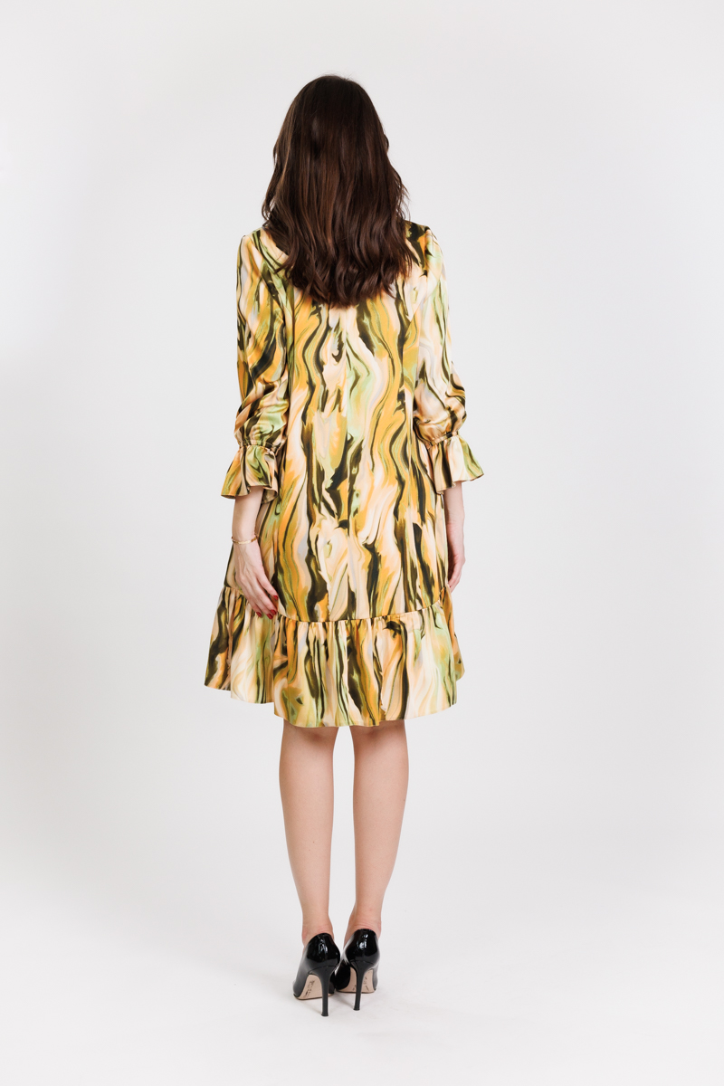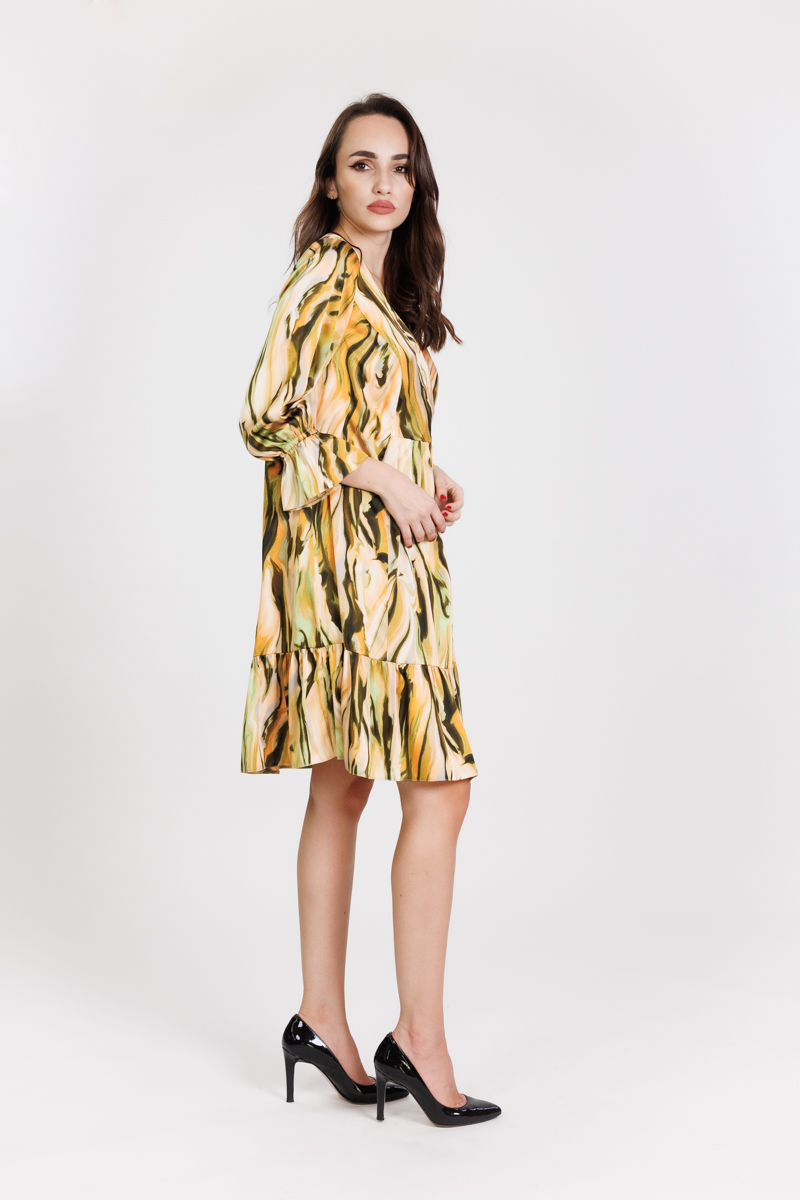 Rochie scurta larga, din material satinat imprimat, cu bust petrecut si volan incretit la lungime,