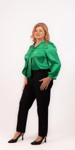 „Bluză din satin lucios, cu imprimeu animal print ton pe ton, guler tip eșarfă și mâneci lungi finisate cu manșete cu nasturi.
