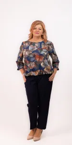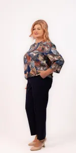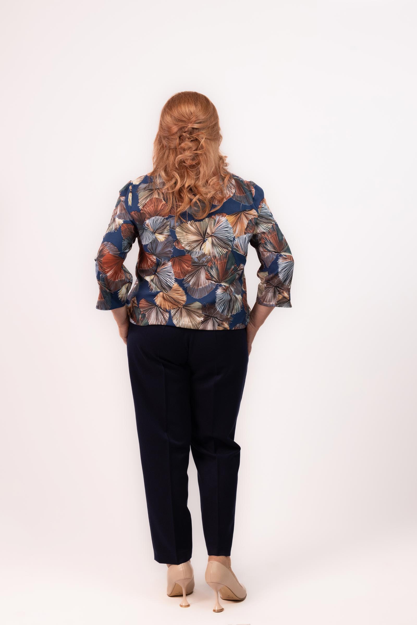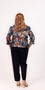 Bluza cu mâneci trei sferturi și imprimeu tomnatic cu frunze în nuanțe calde.