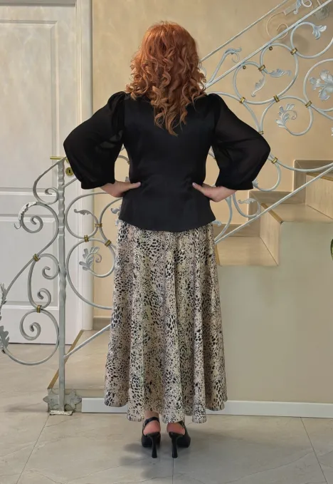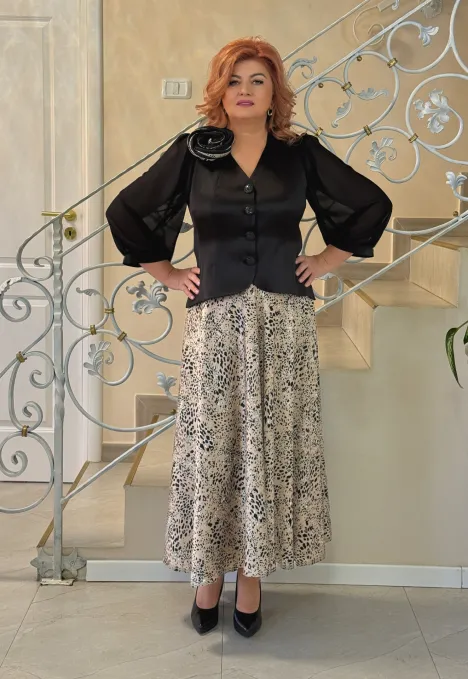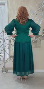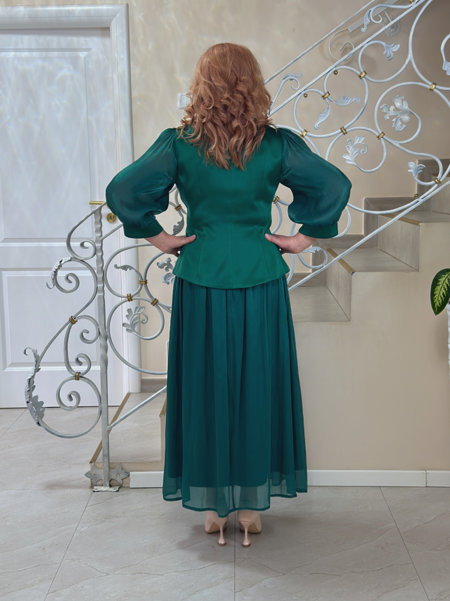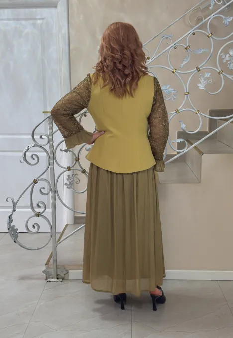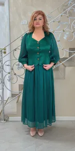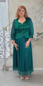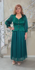 Costum elegant format din rochie plisată și sacou asortat. Sacoul are decolteu în V, mâneci din voal și nasturi decorativi, completând perfect rochia fluidă și feminină