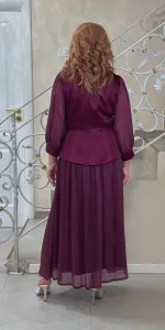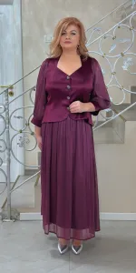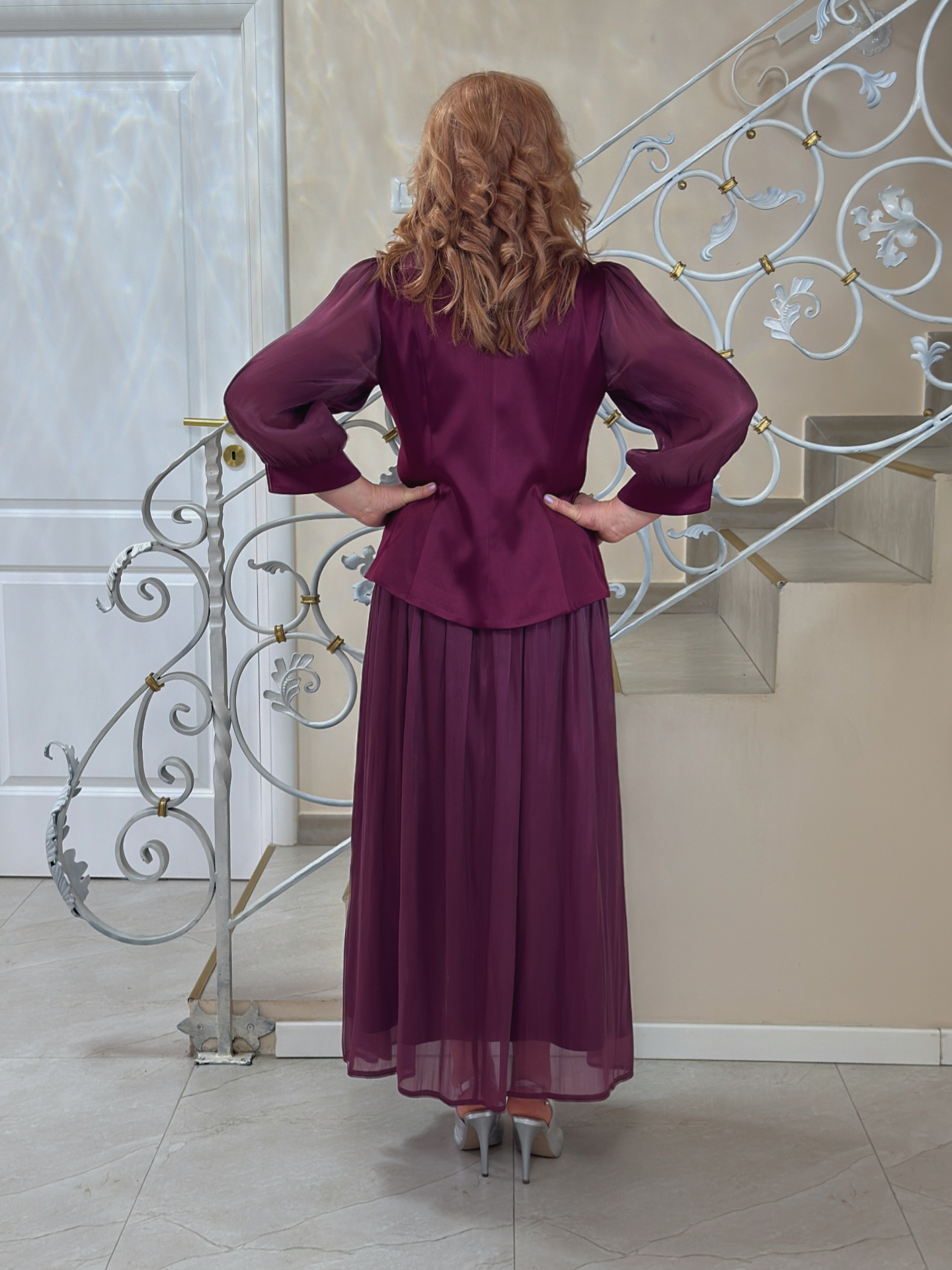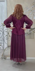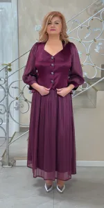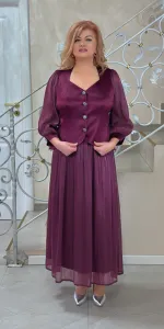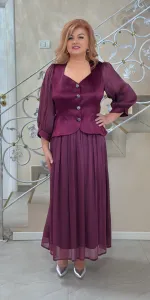 Costum elegant format din rochie plisată și sacou asortat. Sacoul are decolteu în V, mâneci din voal și nasturi decorativi, completând perfect rochia fluidă și feminină