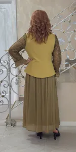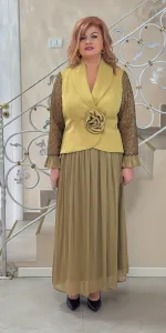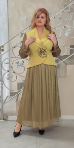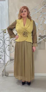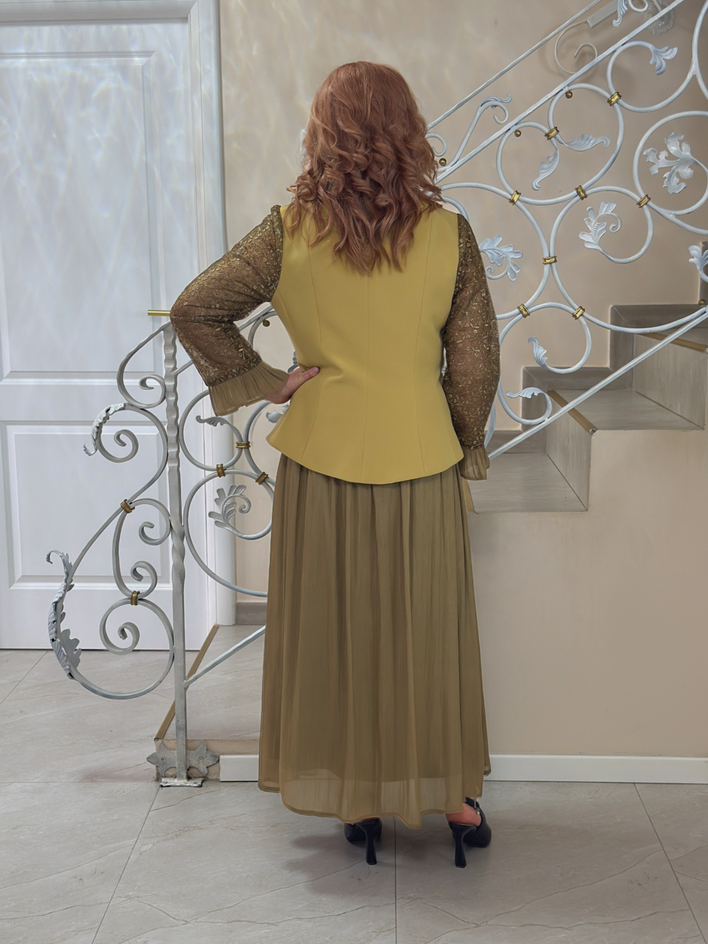 Un costum elegant compus dintr-o fustă lungă, plisată, și o piesă superioară tip sacou cu închidere petrecută, evidențiată de un detaliu floral decorativ în talie. Mânecile sunt realizate din material fin, ușor transparent, cu textură delicată, oferi