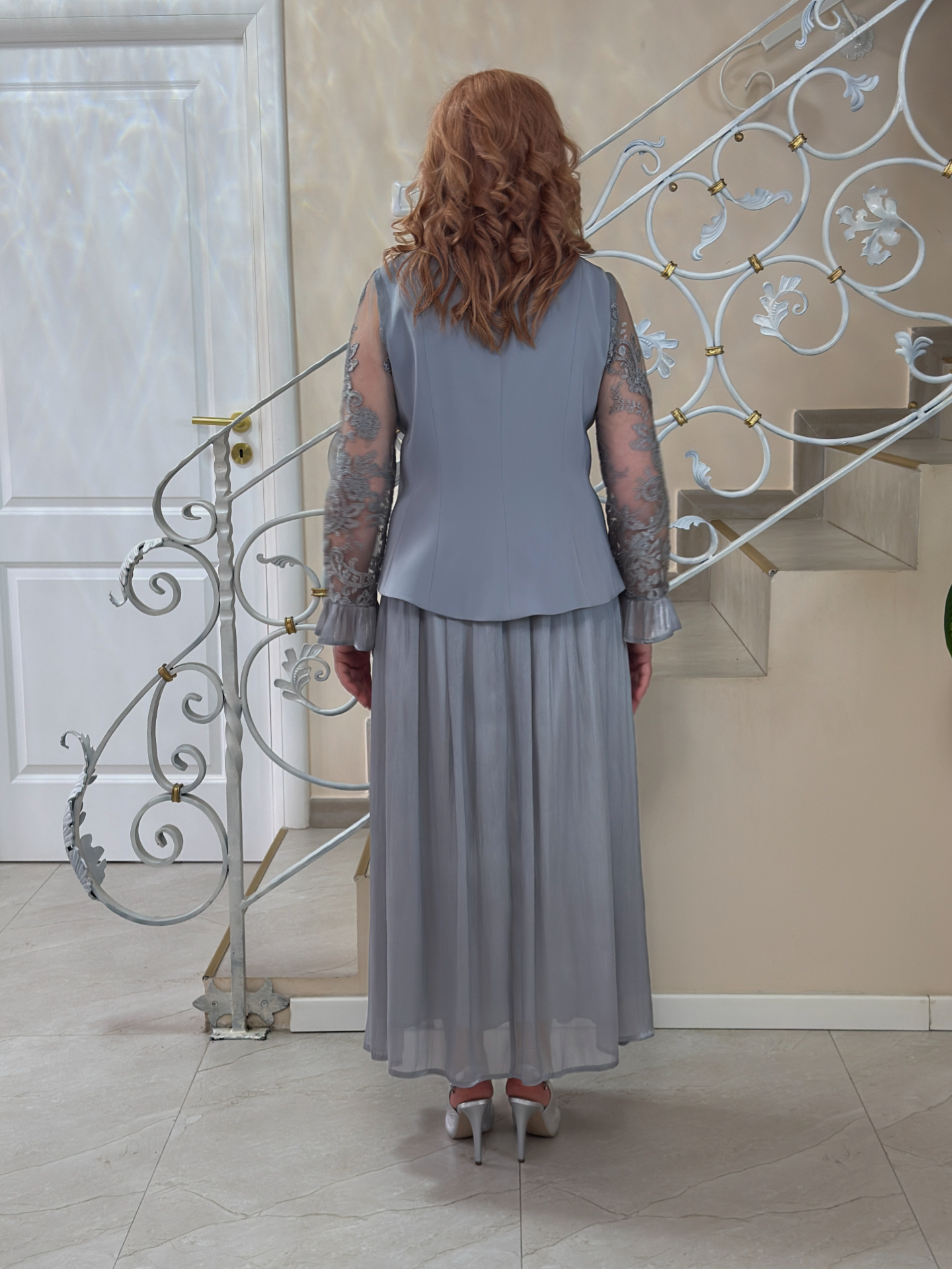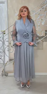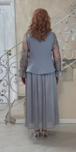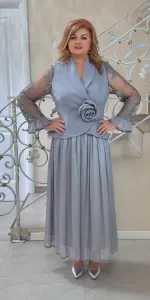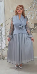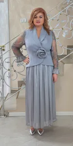Un costum elegant compus dintr-o fustă lungă, plisată, și o piesă superioară tip sacou cu închidere petrecută, evidențiată de un detaliu floral decorativ în talie. Mânecile sunt realizate din material fin, ușor transparent, cu textură delicată, oferi