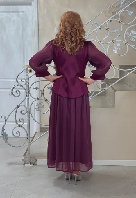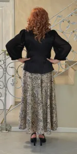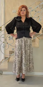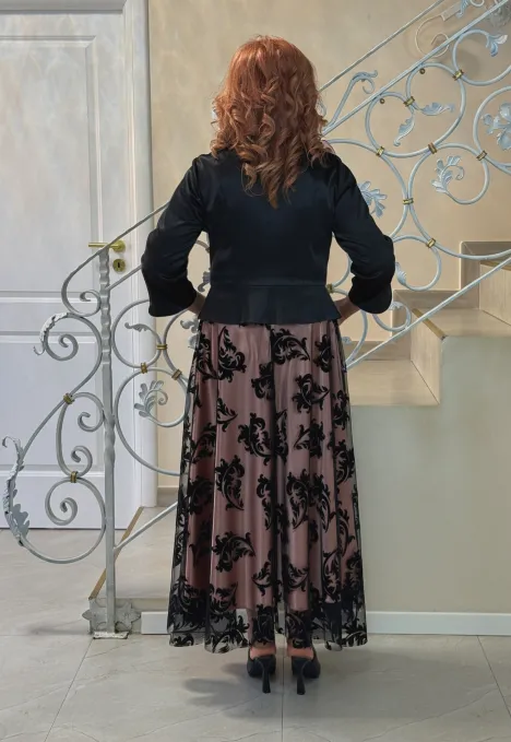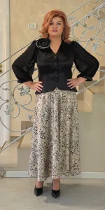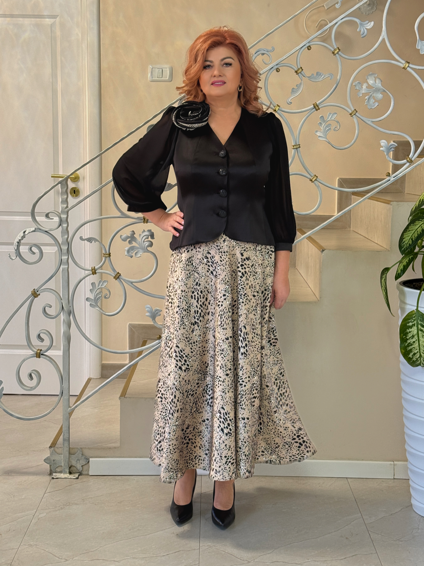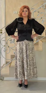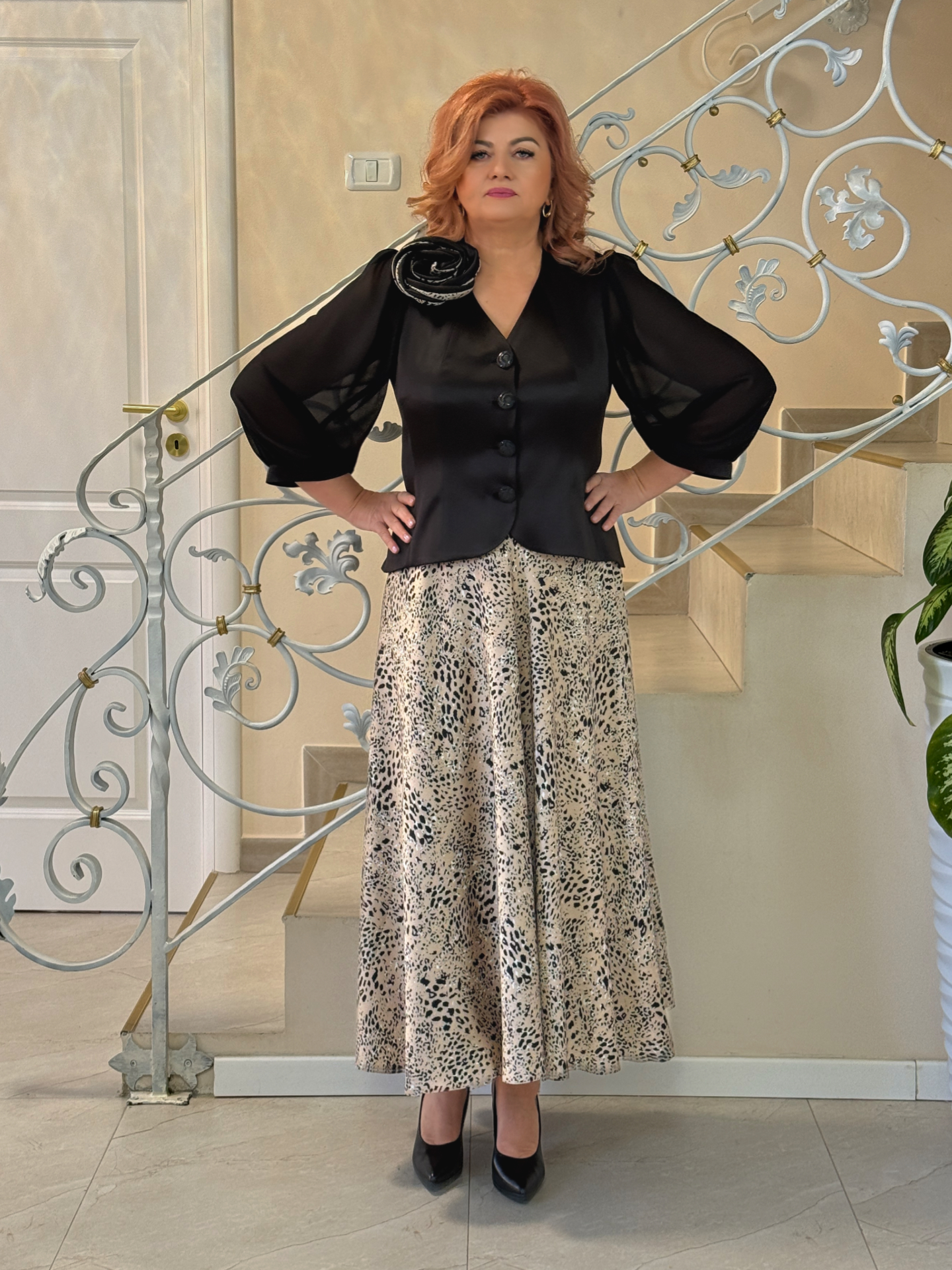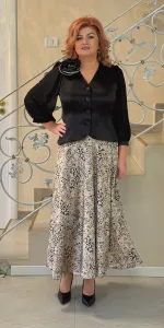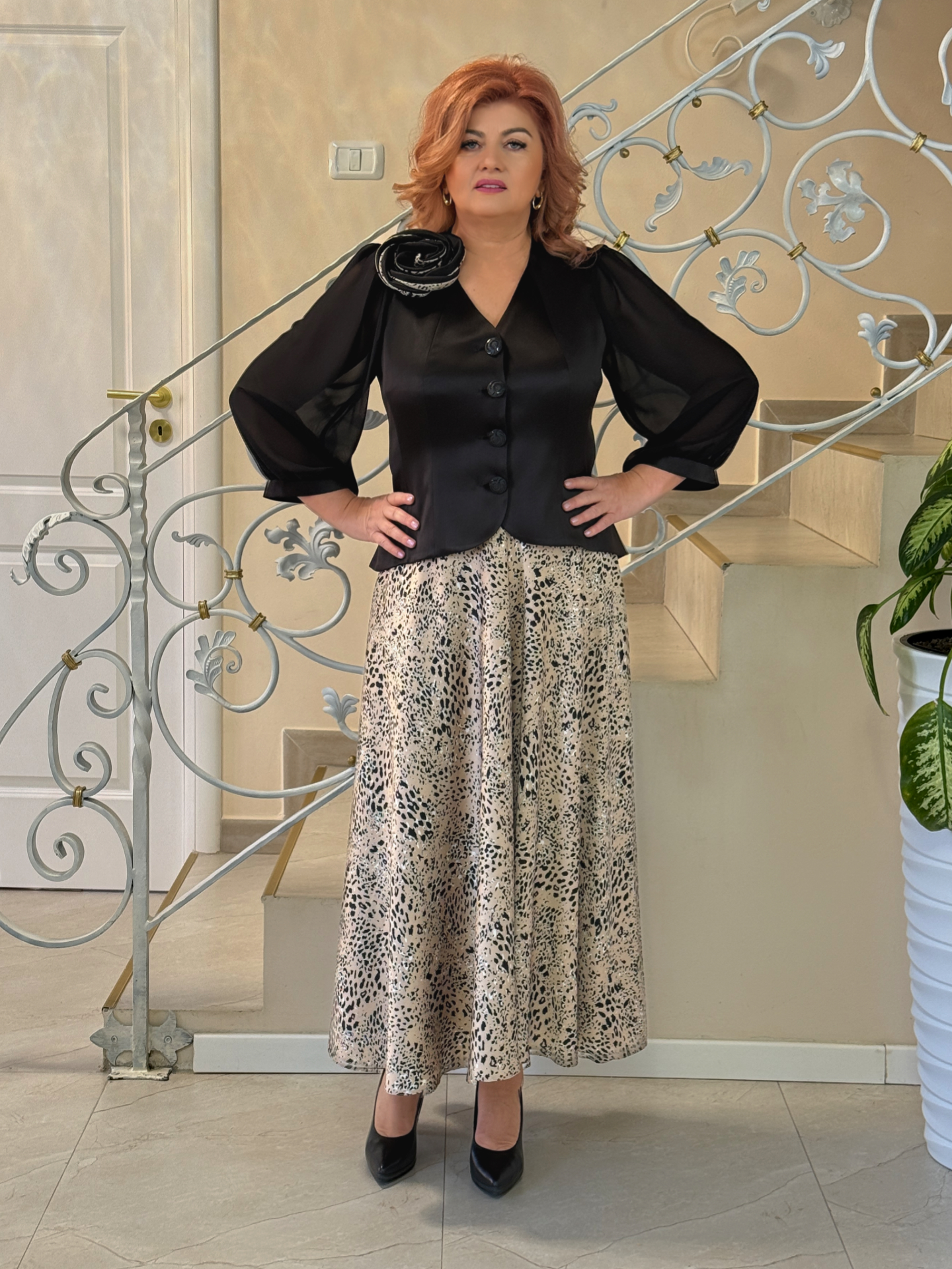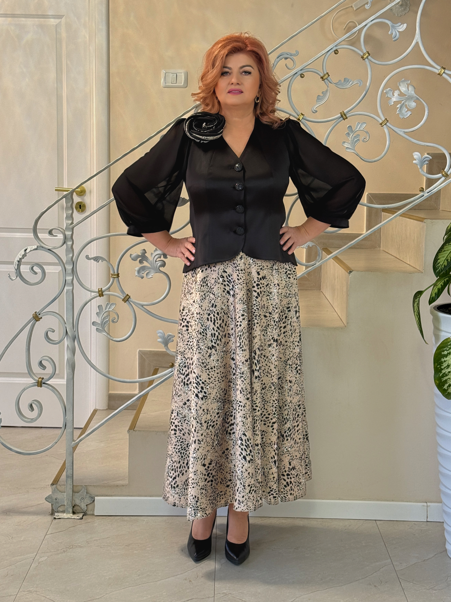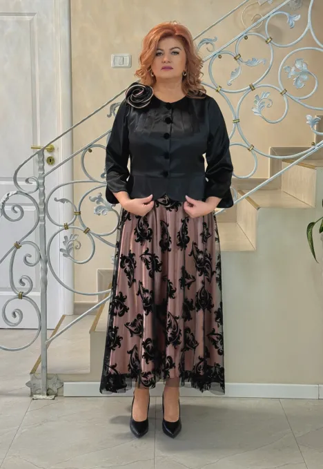 Costumul este elegant și feminin, potrivit pentru o apariție rafinată. Partea de sus este o bluză neagră din material ușor transparent, cu mâneci vaporoase și un detaliu floral decorativ pe umăr, care adaugă un plus de stil. Fusta este lungă, amplă,