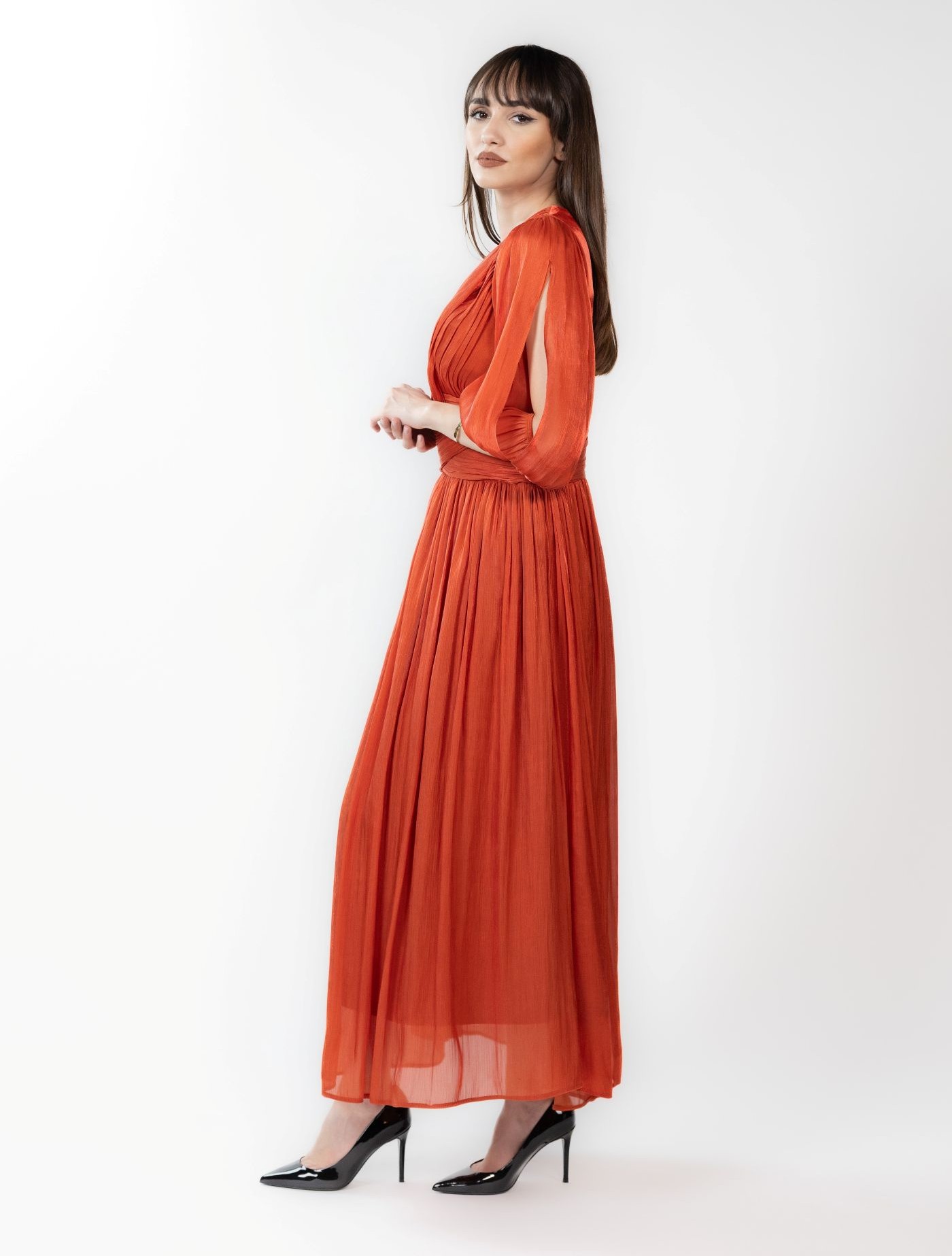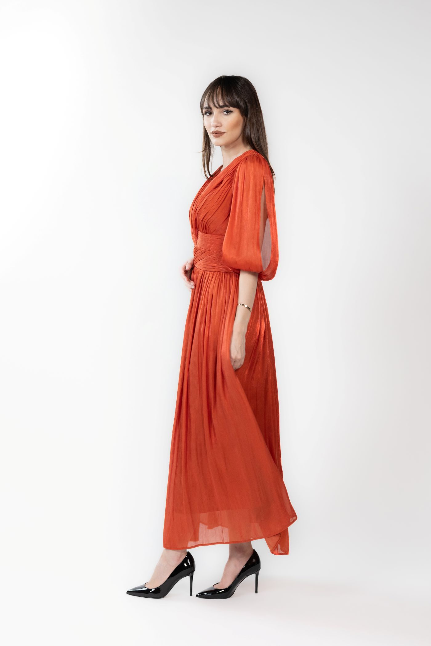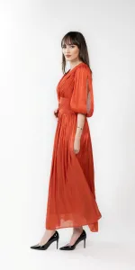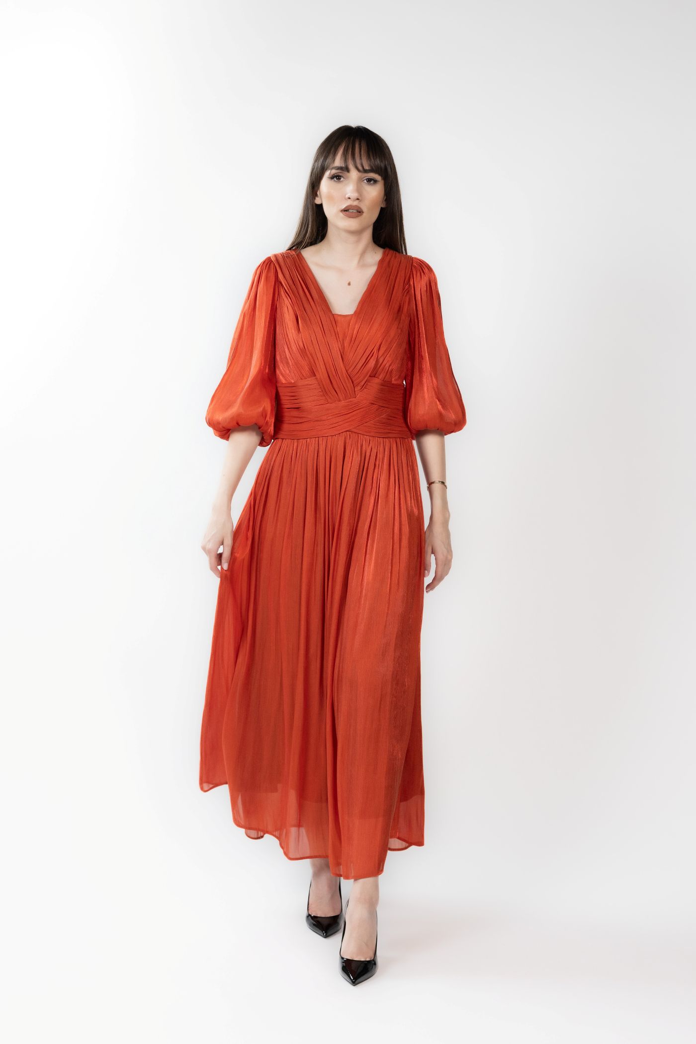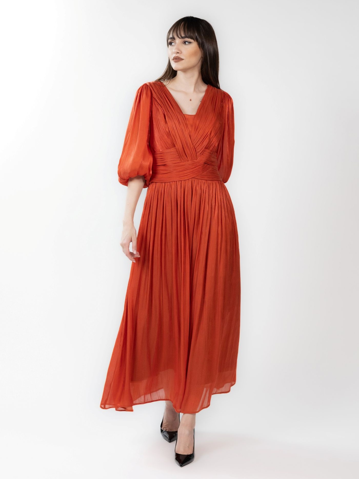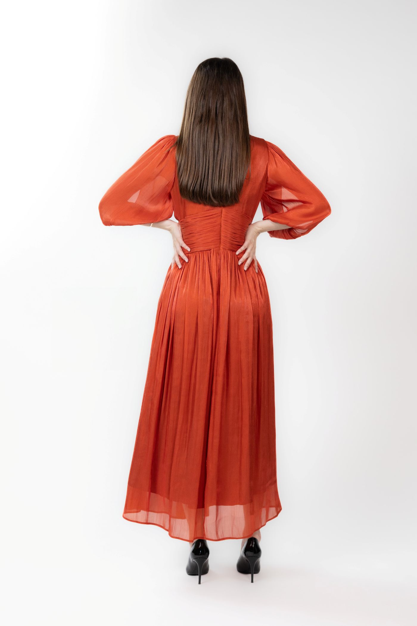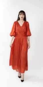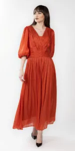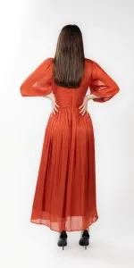 Rochie midi din voal cu incretituri, decolteu in V si bust cu aspect petrecut. Manecile sunt bufante si crapate pe mijloc, iar la terminatie au insertie de elastic.