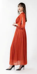 Rochie din voal metalizat cu incretituri, bust asimetric si umar gol. Manecile dunt crapate pe mijloc.